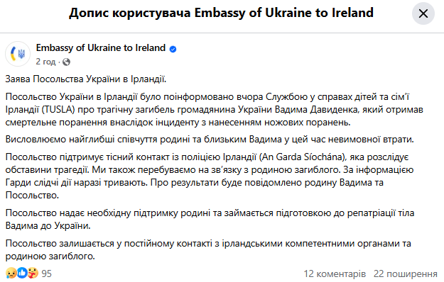 Посольство України в Ірландії прокоментувало резонансне вбивство 17-річного українського підлітка Вадима Давиденка в Дубліні. За інформацією дипломатів, Служба у справах дітей та сім’ї Ірландії (TUSLA) повідомила про трагедію, яка сталася внаслідок інциденту з ножовими пораненнями, повідомляє jerelo.com.ua з посиланням на facebook.com. Українське посольство висловлює співчуття родині та запевняє, що всі обставини трагедії ретельно відслідковуються.