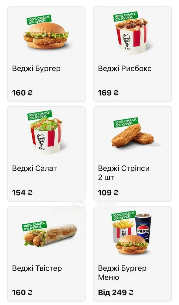 Меню ресторану поєднує класичні KFC-позиції та нові рослинні страви: «Веджі бургер», «Веджі твістер», рисбокс із веджі-стрипсами, салати та інші делікатеси для всіх, хто обирає здорове харчування.