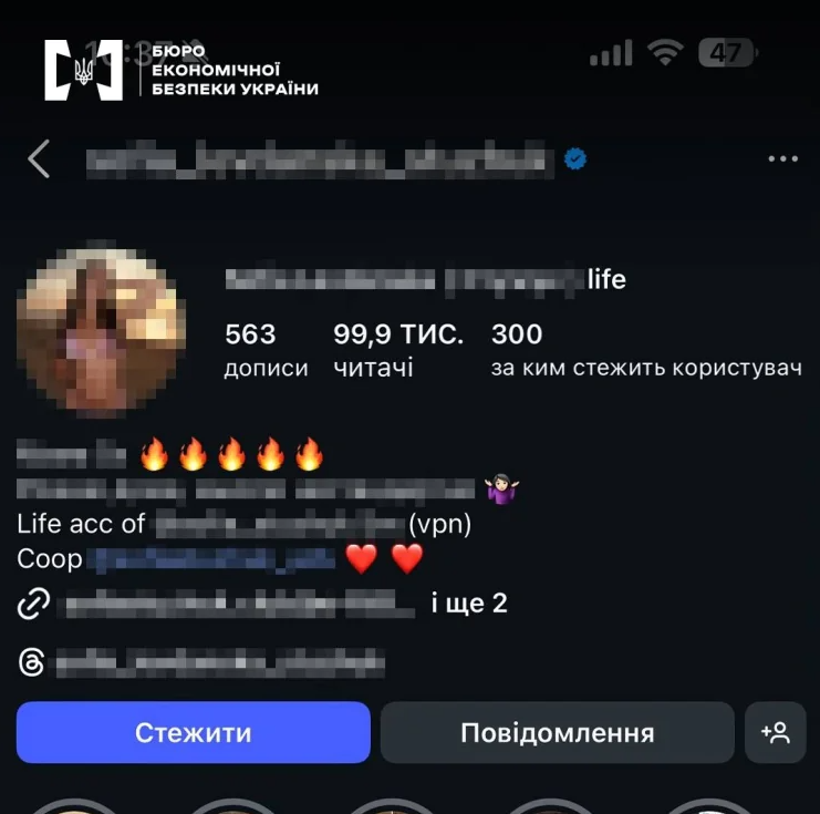 Хоча правоохоронці офіційно не називають ім’я підозрюваної, опублікований скриншот інстаграм-сторінки Бюро економічної безпеки чітко вказує на Софію Стужук-Левданську. Блогерка з початку повномасштабного вторгнення Росії мешкає за кордоном, тому підозру їй оголосили заочно.