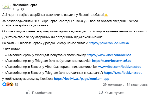 У Львові та Львівській області з 18:00 запроваджено дві черги графіків аварійних відключень, повідомляли у Львівобленерго.