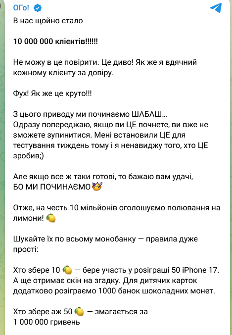 А поки користувачі збирають лимони та змагаються за призи, нагадуємо, що Monobank також опинився у центрі скандалу: Ксюшу Манекен пограбували на 6,2 млн грн – що обіцяє зробити банк і як можна повернути кошти.