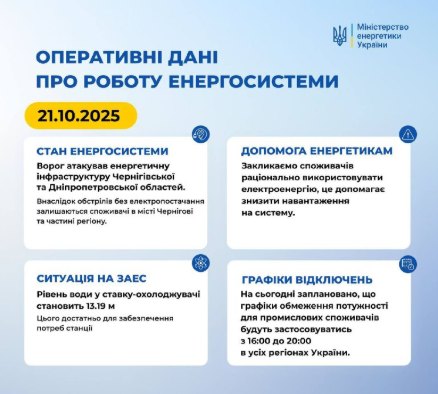 Енергосистема України залишається під сильним тиском через постійні російські атаки. За даними Міністерства енергетики, станом на 21 жовтня зафіксовані нові удари по енергетичній інфраструктурі Чернігівської та Дніпропетровської областей. Внаслідок обстрілів у місті Чернігові та навколишніх населених пунктах відсутнє електропостачання, що створює додаткове навантаження на загальну систему.