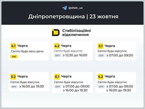 В Україні оприлюднили графіки відключень електроенергії для Дніпропетровської області, які набудуть чинності вже завтра, 23 жовтня. Це необхідно для збалансування енергосистеми та запобігання перевантаженням мережі, повідомляє jerelo.com.ua з посиланням на ДТЕК. Планові вимкнення світла допоможуть забезпечити стабільну роботу енергетичної системи в регіоні.