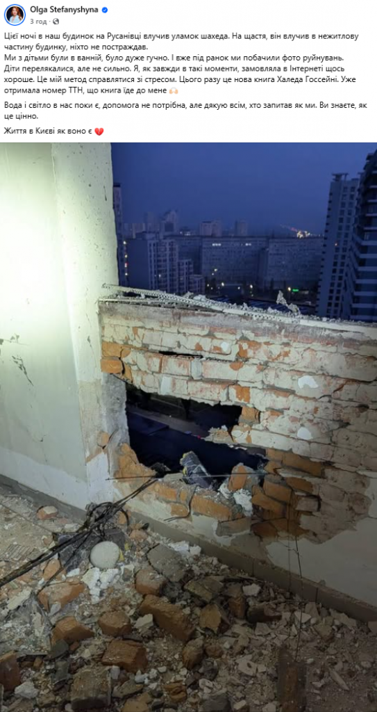 “Цієї ночі в наш будинок на Русанівці влучив уламок ‘Шахеда’. На щастя, він потрапив у нежитлову частину, ніхто не постраждав. Ми з дітьми були у ванній, було дуже гучно. І вже під ранок ми побачили фото руйнувань”.