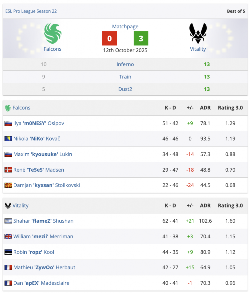 На Train flameZ продовжив домінувати, здобувши 16 фрагів у першій половині на боці CT (8–4), а його ключові ентрі на B допомогли команді закріпити перевагу. На Dust2 він вже міг трохи розслабитися — чудову гру показав mezii, але flameZ і тут відзначився клатчем 1v2 та ще чотирма важливими ентрі-фрагами.
