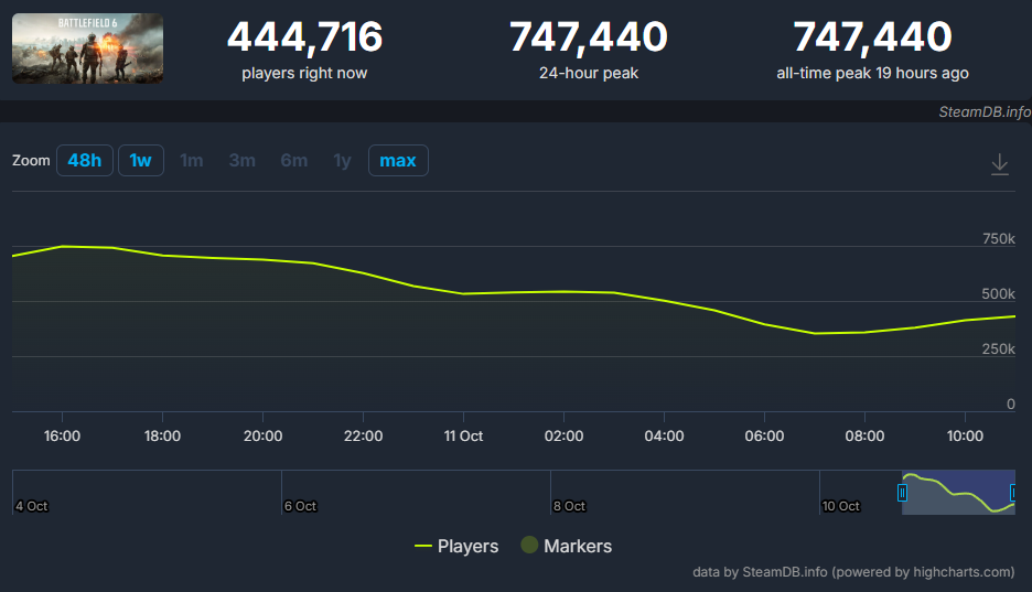 За онлайн-активністю Battlefield 6 обійшла більшість конкурентів, поступаючись лише таким великим проектам, як Baldur’s Gate 3 (875 тисяч) та Hogwarts Legacy (879 тисяч). Для порівняння, піковий онлайн відкритої бети Battlefield 6 складав близько 520 тисяч гравців, що демонструє значне зростання популярності у фінальній версії.