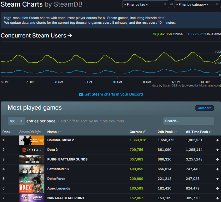 Поки Electronic Arts святкує успіх релізу Battlefield 6, Valve також має чим похвалитися. 12 жовтня одночасна кількість користувачів Steam перевищила 41,6 мільйона, встановивши новий абсолютний рекорд платформи. З них близько 13 мільйонів гравців активно грали в різні ігри, що свідчить про стабільний ріст популярності сервісу. Це значне досягнення демонструє, наскільки Steam залишається провідною платформою для онлайн-геймінгу, повідомляє jerelo.com.ua.