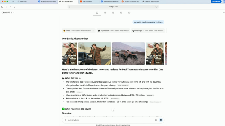 Під час роботи в Atlas на будь-якій сторінці з’являється кнопка «Ask ChatGPT», яка відкриває бічну панель для роботи з контентом. Наприклад, користувач може відкрити рецензію на фільм і попросити ШІ зробити короткий виклад.