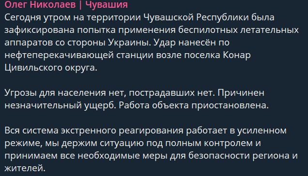 Сьогодні вранці на території Чуваської республіки Росії зафіксовано атаку безпілотних літальних апаратів, повідомляє сайт jerelo.com.ua посилаючи на телеграм-канал . Дрони завдали ударів по нафтоперекачувальній станції біля селища Конар Цивільського округу, що призвело до її тимчасового зупинення. За словами російських чиновників, інцидент стався через спробу застосування БпЛА на стратегічному об’єкті регіону. Це вже не перший випадок атак на інфраструктуру Чуваської республіки в цьому році.