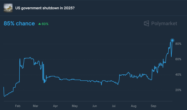 На тлі політичної невизначеності імовірність шатдауну вже оцінюють у 85% на платформі для ставок Polymarket. Варто нагадати, що востаннє уряд США припиняв роботу сім років тому під час першої каденції Трампа. Той шатдаун став рекордним в історії країни — на його подолання пішло 36 днів.