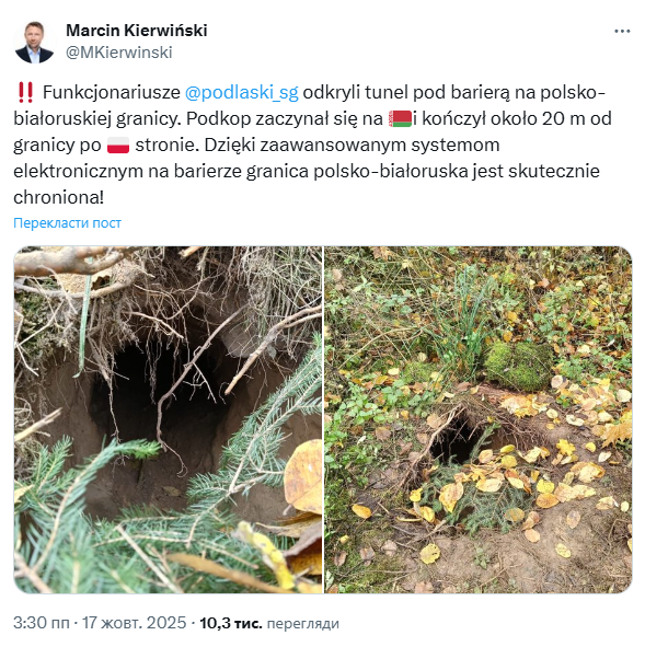 Очільник МВС Польщі Марцін Кервінський повідомив про знахідку у соцмережі X, де опублікував фото підкопу. За словами міністра, підкоп починався на білоруській стороні і закінчувався приблизно за 20 метрів від паркану на польській території. Він підкреслив, що завдяки передовим електронним системам безпеки польсько-білоруський кордон залишається ефективно захищеним. Такі технології дозволяють оперативно виявляти будь-які спроби нелегального проникнення.