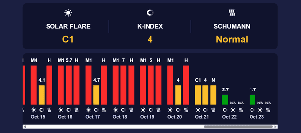 Станом на 21 жовтня індекс геомагнітної збуреності (K-індекс) становить 4, що відповідає помірному рівню. Резонанси Шумана залишаються у межах норми, тож серйозних коливань у біосфері наразі не спостерігається.